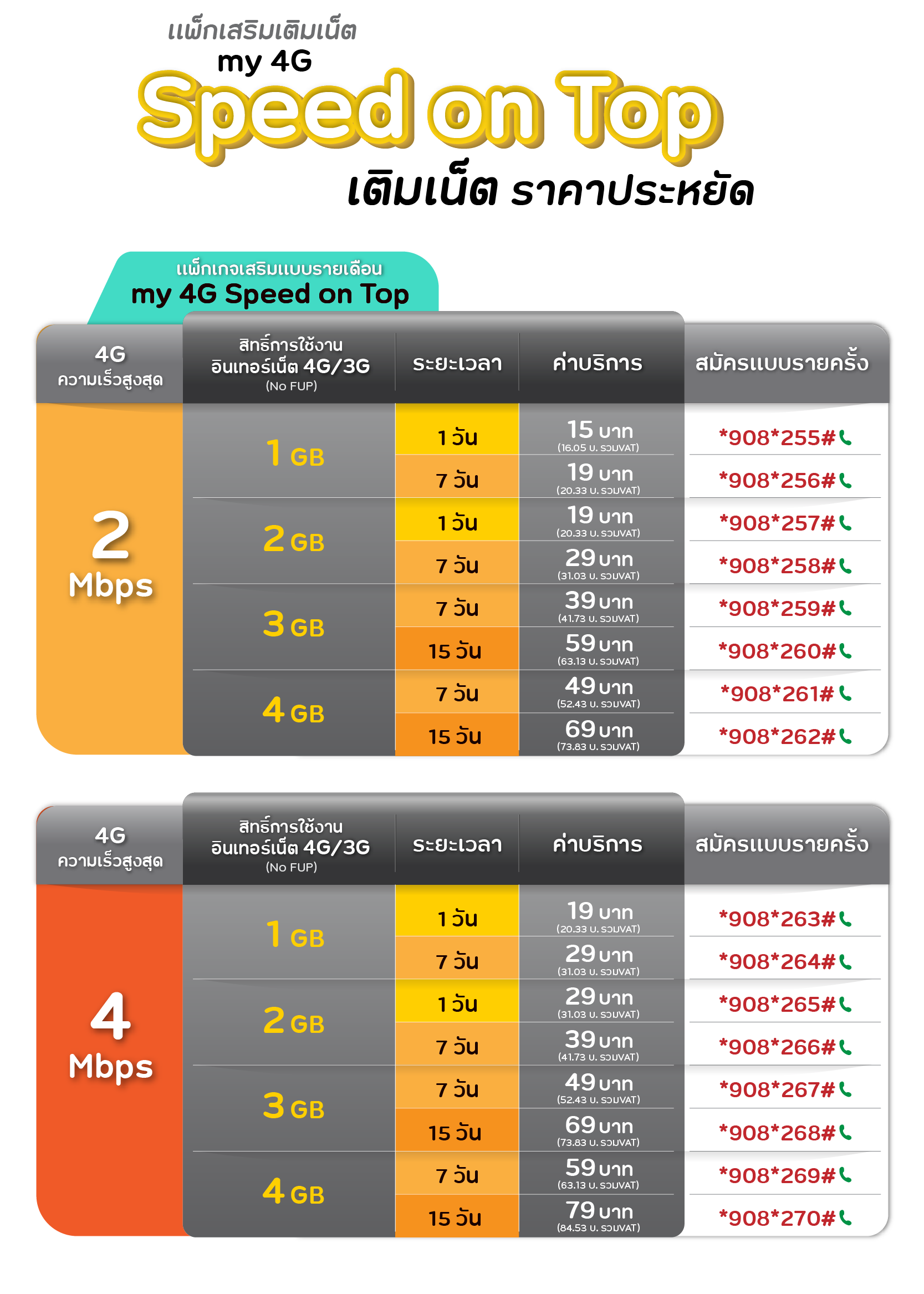 แพ็กเกจเสริม “my 4G Speed on Top” แบบรายเดือน (Postpaid) สามารถใช้งานคู่กับแพ็กเกจหลัก (PO) แบบรายเดือน (Postpaid) ที่ให้สิทธิ์ใช้งานอินเทอร์เน็ตต่อเนื่อง เท่านั้น