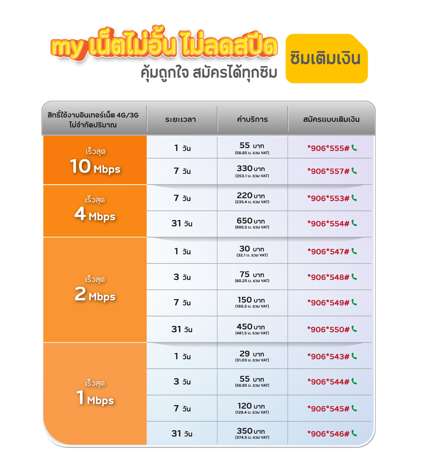 อัตราค่าบริการแพ็กเกจเสริมยังไม่รวมภาษีมูลค่าเพิ่ม (VAT 7%)